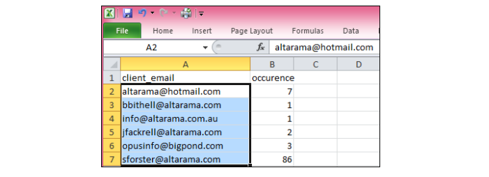 When exported, the email addresses can easily be selected and pasted into an email “To:” list (your email client will semicolon separate them). This is useful for sending followup surveys to all the clients who have used your service recently.