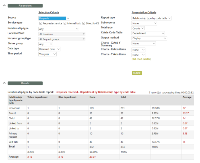 In conjunction with the Service type selection criteria, the “Relationship type by code table” report shows Individual requests (no dependencies), Parent, Child (created by Linked using parent/child relationship), Linked to, Linked from (created by Linked using Linked to/from relationship), Primary and Sub task (created by Create a sub task). Use it to see the relative numbers of Primary, Linked, and Internal questions.
