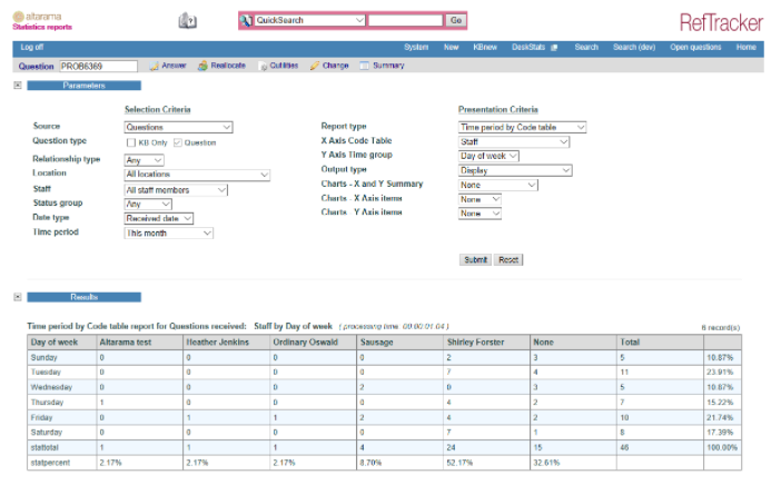 It allows you to analyse the incoming or outgoing traffic from your RefTracker system (for the whole system or separately for full questions and DeskStats), by specified time periods within your selected time period – for example “how many questions were handled by each staff member each day during the selected time period”, or “for each month within the selected period, how many questions of each different request type were answered”.
